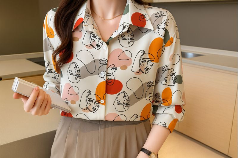 Women's Printed Cotton Silk Long Sleeve Collar Neck Tunic Shirt